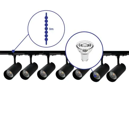 Complete Set 1-Fase Rail 3 Meter Zwart | incl. 7x Spot + GU10 2700K 3W Dimbaar + Eindkap, Voedingsconnector en I-Verbindingsstuk